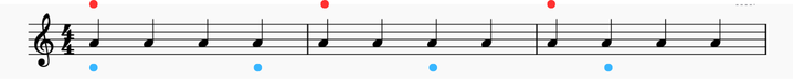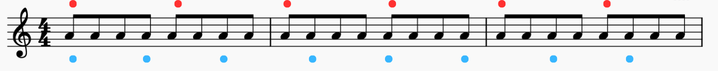【応用1】8分音符で赤丸は2分音符ごとにアクセント。青丸は1拍半ごとにアクセントの例です。