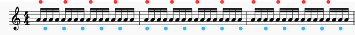 【応用2】16分音符で赤丸は1拍ごとにアクセント。青丸は頭16分音符を休んで付点8分音符ごとにアクセントの例です。