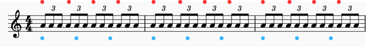 【応用3】これはよく使われる代表例の1つです。3連符で赤丸は1拍ごとにアクセント。青丸は3連符を4つごとにアクセントの例です。特に8分の6拍子や8分の9拍子などで活用した曲などよく見かけます。