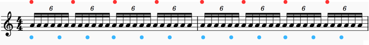 【応用4】6連符で赤丸は1拍ごとにアクセント。青丸は6連符を4つごとにアクセントの例です。
