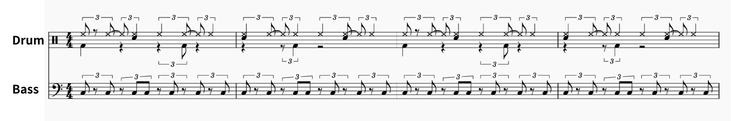 下記の例では3連符を基盤としたリズムの上でベースは4分音符を感じたベースライン。ドラムは3連符を4つで割り、且つ8ビートに聴こえるように叩く場所(スネアやバスドラ、ハイハット)を変えてみました。